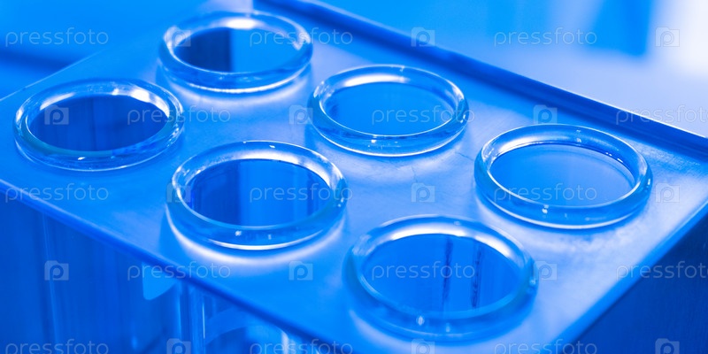 В стойке много пробирок. Верхняя часть пробирок
