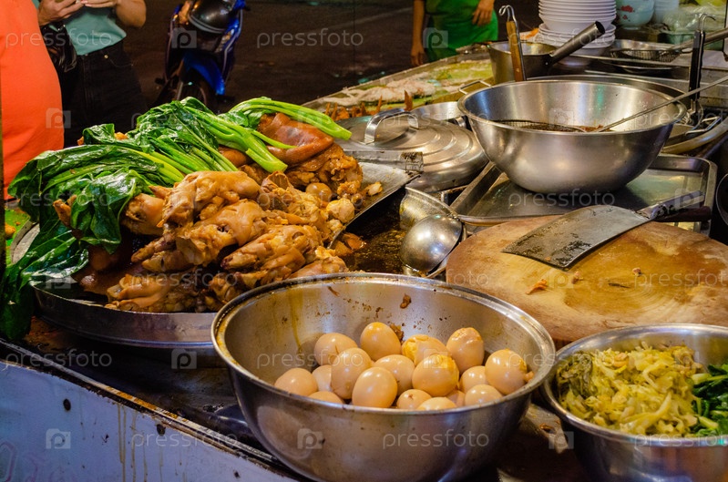 Ингредиенты для приготовления традиционных тайских блюд в уличной местной тайской закусочной. Вареная свинина, маринованные яйца, овощи и зелень для приготовления ужина в Таиланде