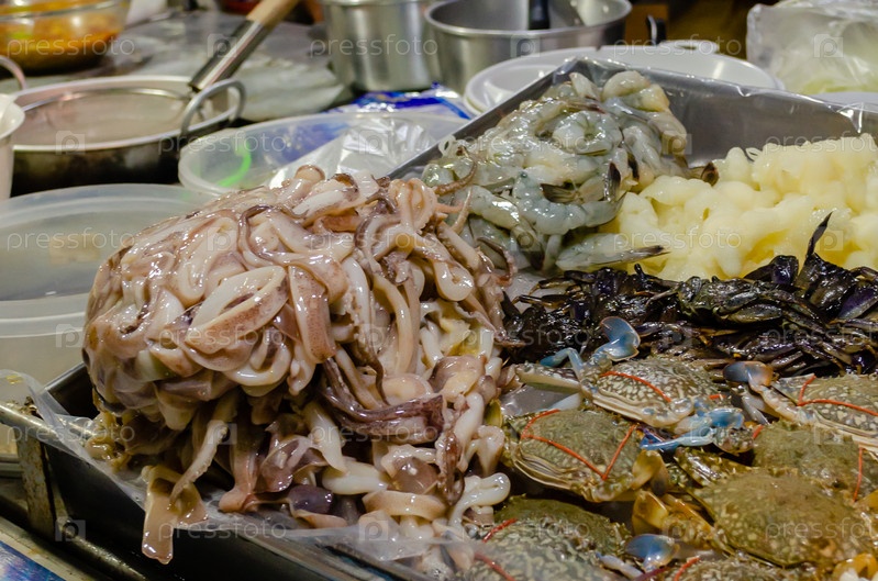 Ингредиенты для приготовления классических тайских блюд в уличной местной тайской закусочной. Кальмары, креветки, крабы, осьминоги и другие морепродукты для традиционного тайского ужина