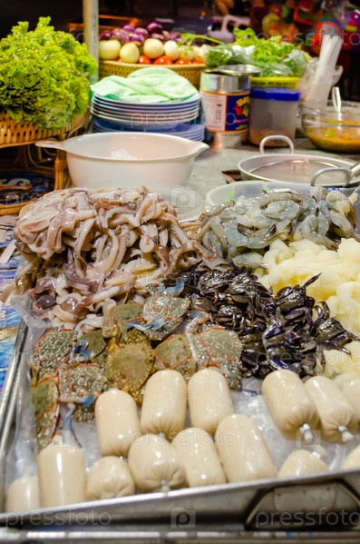 Ингредиенты для приготовления классических тайских блюд в уличной местной тайской закусочной. Кальмары, креветки, крабы, осьминоги и другие морепродукты для традиционного тайского ужина