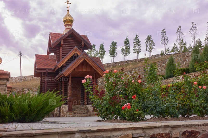 Часовня с клумбами из роз. Уединенная деревянная часовня с куполом и христианским крестом на фоне пурпурного закатного неба. Рядом розовые и еловые кусты