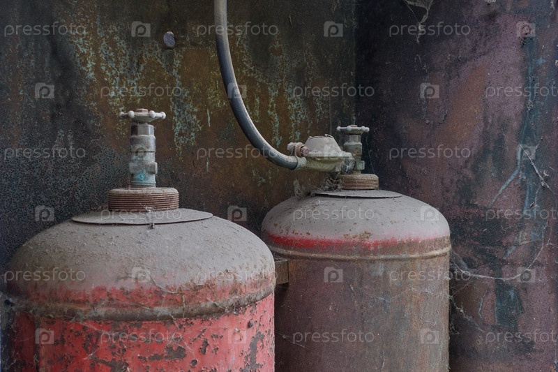 Старый редуктор на газовом баллоне. Ржавые и пыльные резервуары для хранения сжиженного газа для бытового использования находятся в старом железном шкафу
