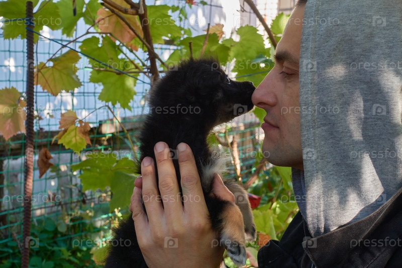 Щенок сидит на руках человека в капюшоне. Маленькая черная собачка лижет нос молодому человеку. На заднем плане сетчатый забор и ветки виноградника. Выборочный фокус