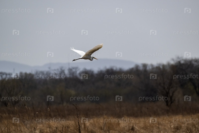Большая белая цапля в полете над болотистой местностью