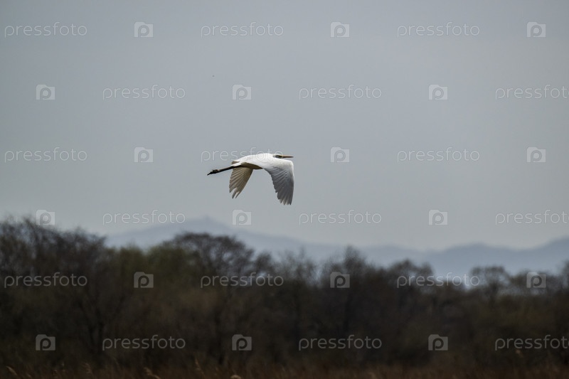 Большая белая цапля в полете над болотистой местностью