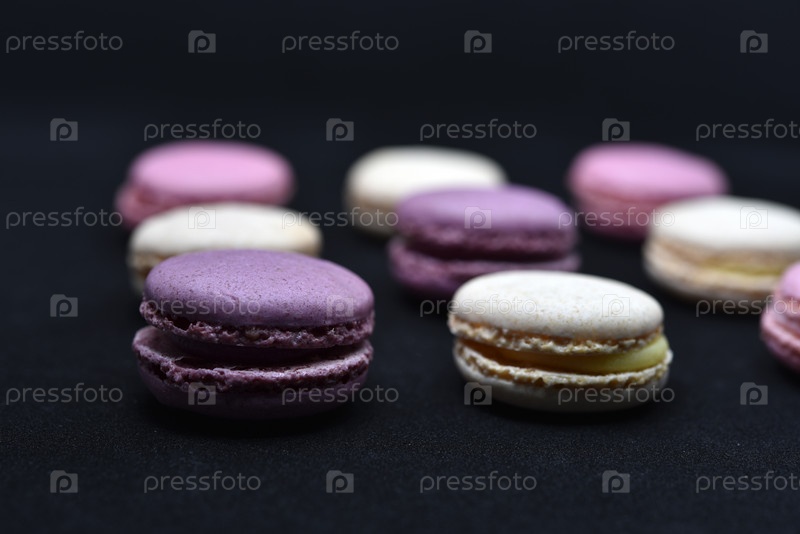 Разноцветное печенье на черном фоне. Печенье макарон крупным планом. Вкусное и сладкое печенье