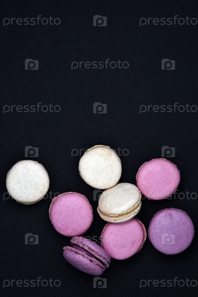 Разноцветное печенье на черном фоне. Печенье макарон крупным планом. Вкусное и сладкое печенье