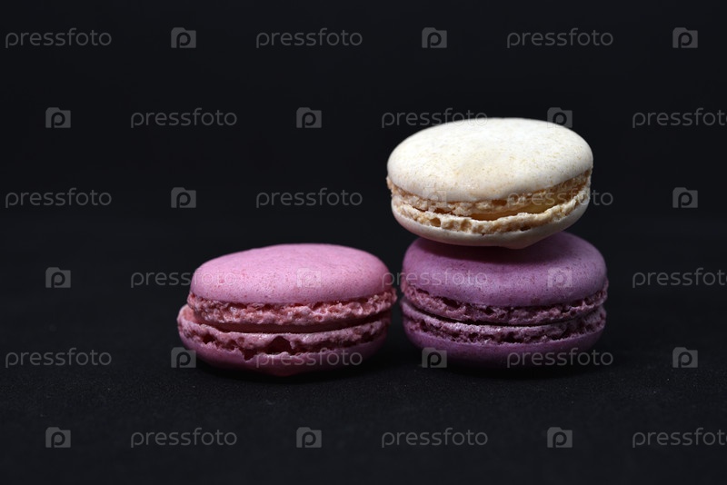 Разноцветное печенье на черном фоне. Печенье макарон крупным планом. Вкусное и сладкое печенье