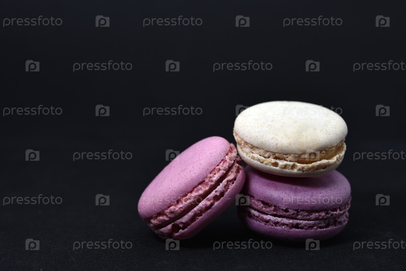 Разноцветное печенье на черном фоне. Печенье макарон крупным планом. Вкусное и сладкое печенье