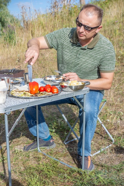 Мужчина на пикнике в летний день ест запеченные овощи. Концепция летней еды на свежем воздухе