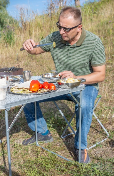 Мужчина на пикнике в летний день ест запеченные овощи. Концепция летней еды на свежем воздухе