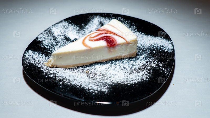 Ломтик чизкейка на темной тарелке. Вид крупным планом. Вкусный нежный чизкейк