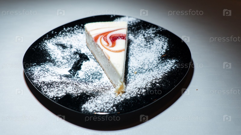 Ломтик чизкейка на темной тарелке. Вид крупным планом. Вкусный нежный чизкейк