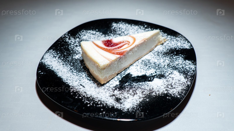 Ломтик чизкейка на темной тарелке. Вид крупным планом. Вкусный нежный чизкейк