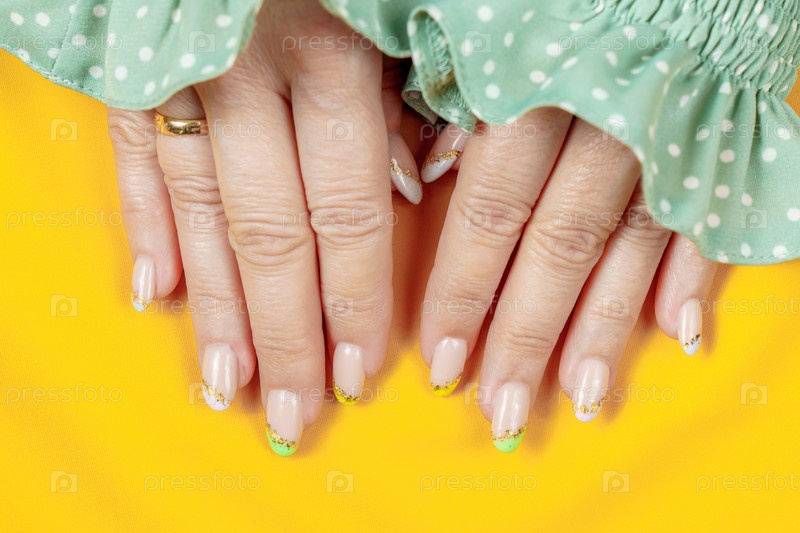 Французский маникюр в зеленых, желтых, фиолетовых тонах на однотонном фоне. Нейл-арт на женских ногтях. Женские руки с маникюром