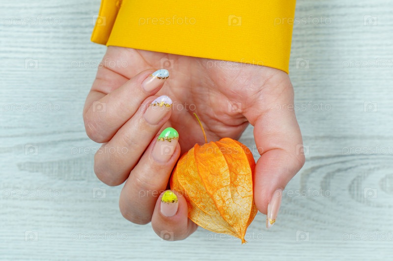 Французский маникюр зеленого, желтого, фиолетового цвета на однотонном фоне. Нейл-арт на женских ногтях. Женские руки с маникюром