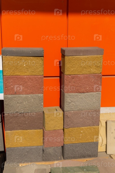 Образцы разноцветных строительных блоков из прессованной цементно-песчаной смеси. Блоки используются для индивидуального строительства и декоративной отделки