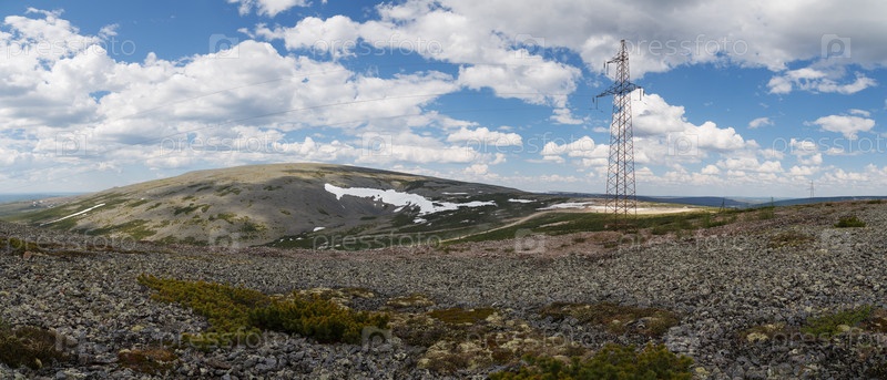 Панорама гор с высоковольтными линиями электропередач в Южной Якутии, Россия