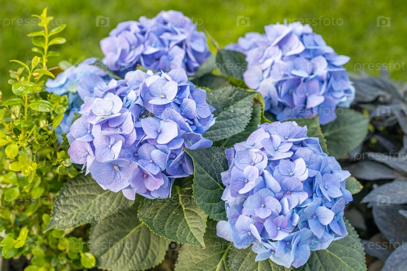 Голубой цветок гортензии. крупный план гортензии в саду. Букет гортензий