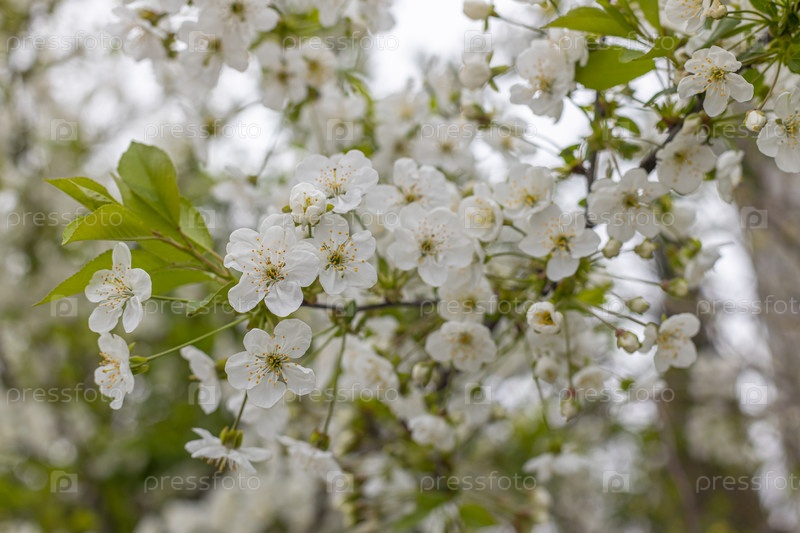 Белые цветущие яблони в лучах солнца. Весенний сезон, весенние краски