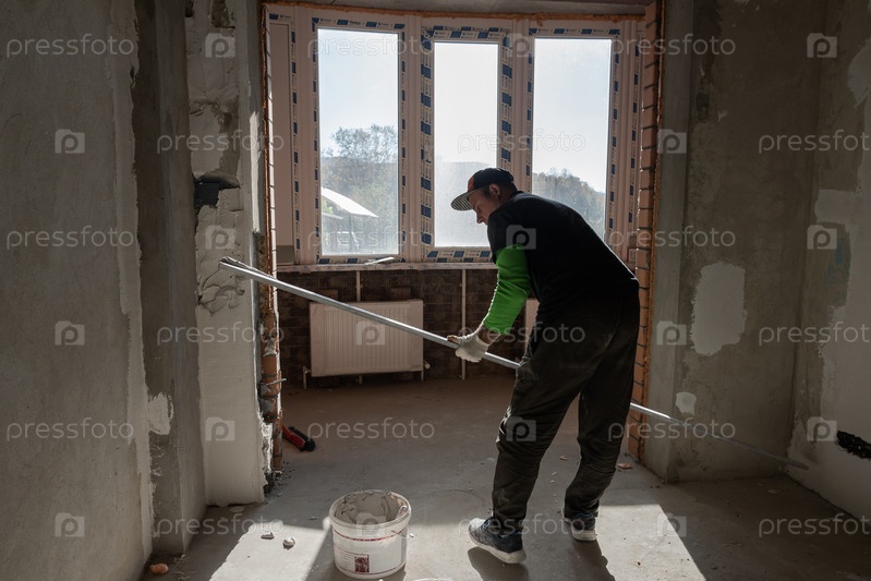 Мужчина в кепке стоит в пустой комнате с алюминиевой линейкой в руках. Декоратор штукатурит комнату. Концепция ремонта помещения