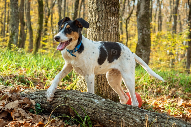 Молодая белая собака с черными пятнами и синим воротником стоит в осеннем лесу, положив лапу на бревно. Крупный план. Зеленая трава и деревья на заднем плане