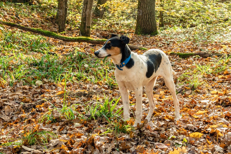 Молодая собака с синим ошейником в осеннем лесу. Крупный план. Зеленая трава, листья и деревья на заднем плане. Концепция выгула собак