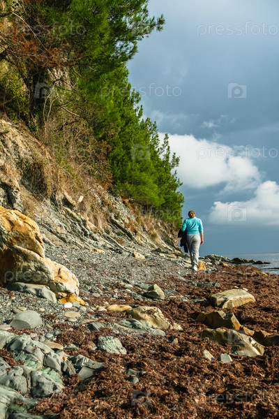 Морское побережье со скалами, сухими водорослями, скалами и елями. Девушка в штанах и толстовке идет по пляжу. Вид сзади. Небо с облаками на заднем плане