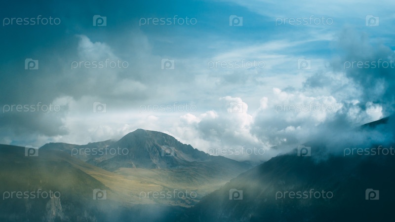 Облака и туман покрывают заснеженную вершину горы и ущелье. Красота природы. Фото для рабочего стола