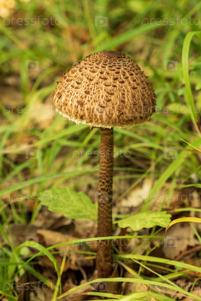 Коричневый зонтичный гриб на длинном стебле среди листьев и травы. Съедобный лесной гриб