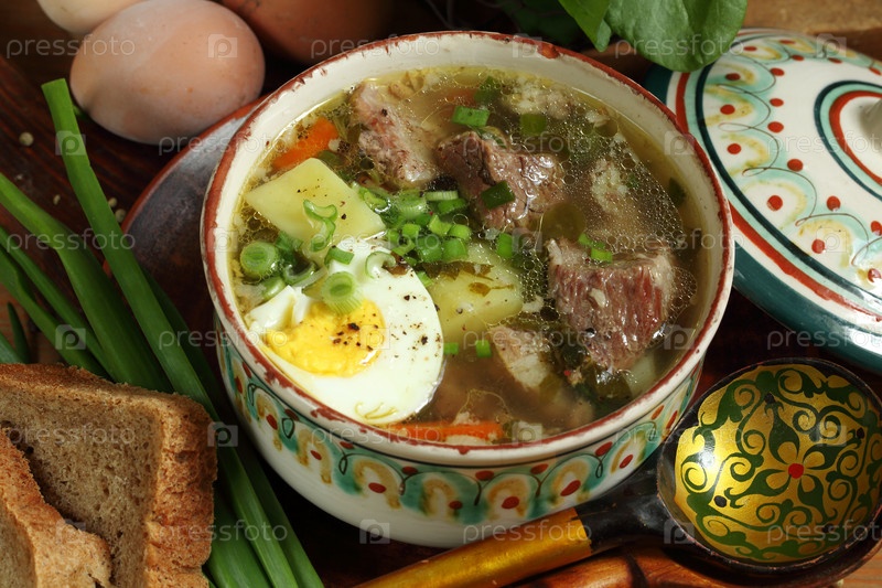 Зеленый борщ со сметаной и ржаным хлебом