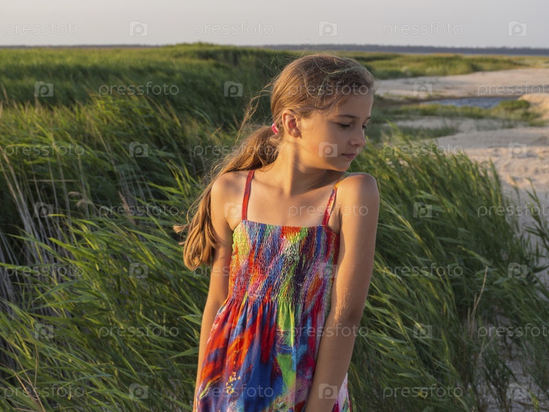 Красивая девочка-подросток в ярком летнем платье в свете заката на фоне зеленых тростников. Походы и отдых на природе