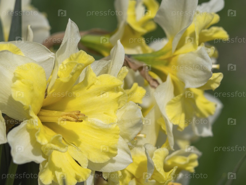 Группа красивых цветов нарцисса крупным планом в солнечный весенний день в саду. Яркие и красочные цветы нарцисса. Красивые цветущие желтые нарциссы на открытом воздухе в солнечный день