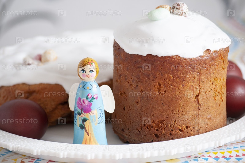 Фигура ангелика возле пасхального кулича.Фигурка ангела рядом с пасхальным тортом