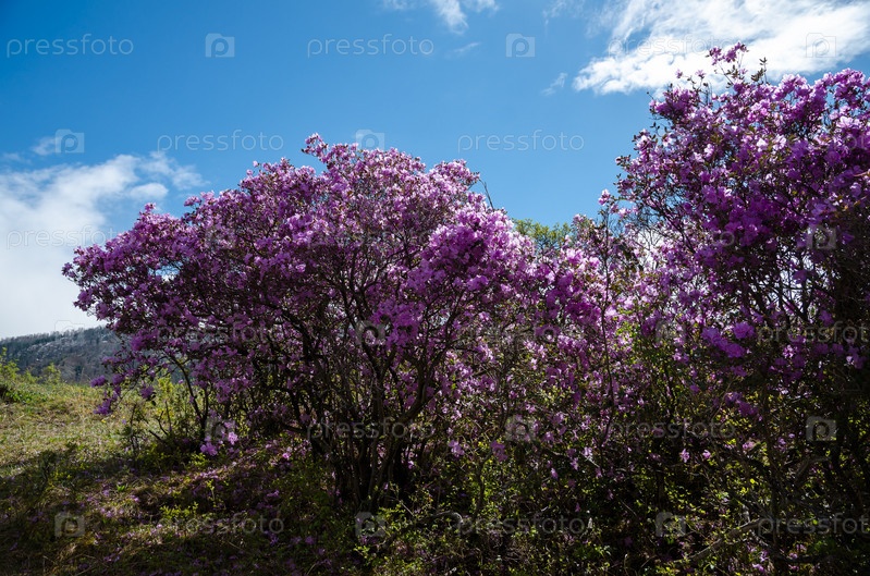 Цветущий маральник Рододендрон Ледебура и небо