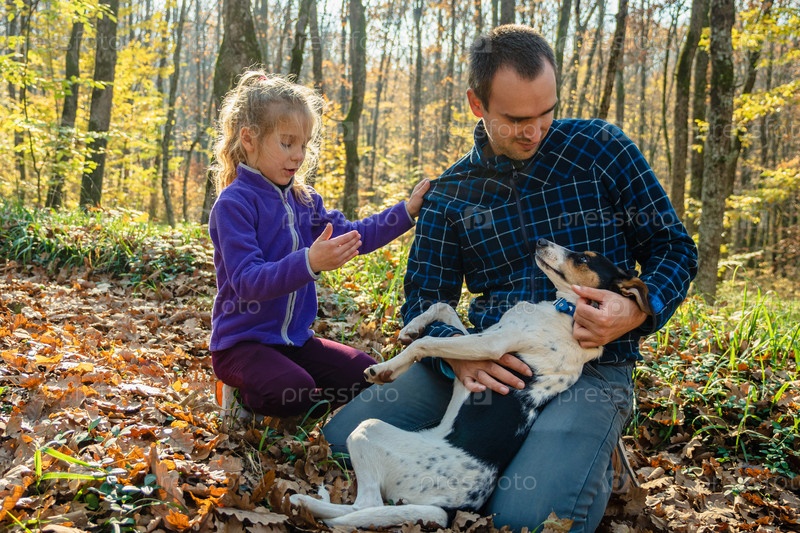 Мужчина в клетчатом кофе и джинсах с ребенком и собакой на коленях сидит в лесу. Отец и дочь в осеннем лесу. Концепция счастливой семьи