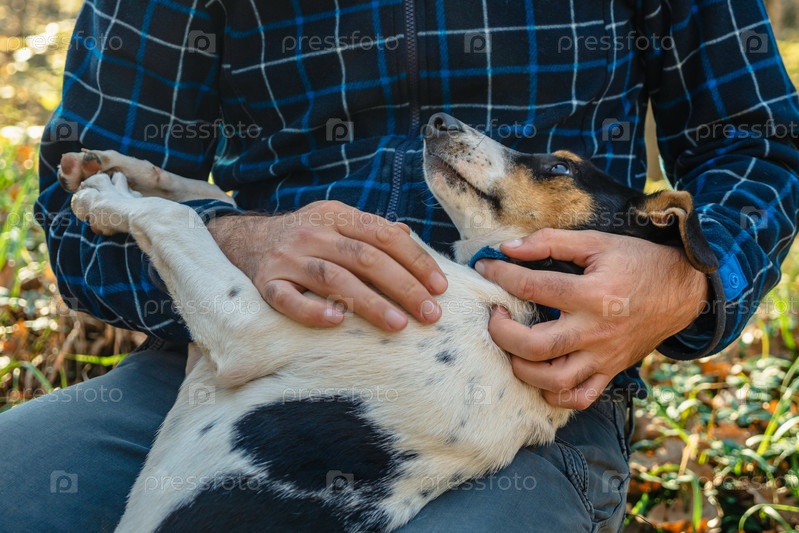 Мужчина гладит собаку. Крупный план. Концепция любви и заботы о домашних животных