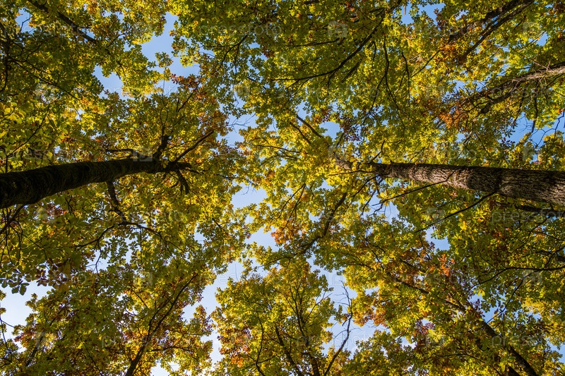 Вид снизу на стволы деревьев с зелено-желтой листвой на фоне голубого неба. Осенний пейзаж