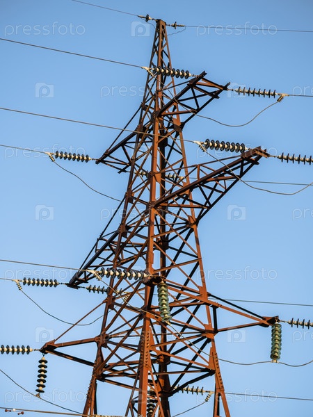 Высоковольтная башня на фоне голубого неба. Индустриальный пейзаж. Концепция энергетического кризиса