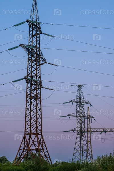 Пилоны и высоковольтные линии электропередач на закате. Индустриальный пейзаж. Концепция энергетического кризиса в Европе