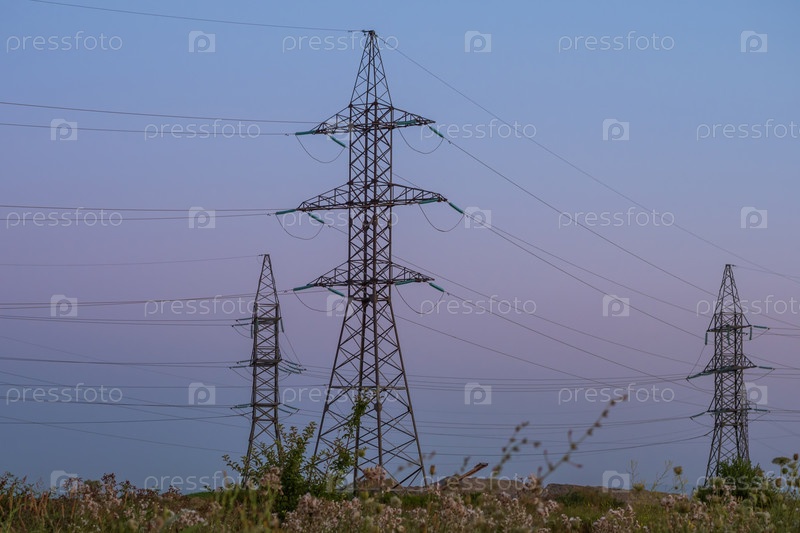 Высоковольтные линии электропередач и высоковольтная металлическая опора в сумерках. Концепция энергетического кризиса
