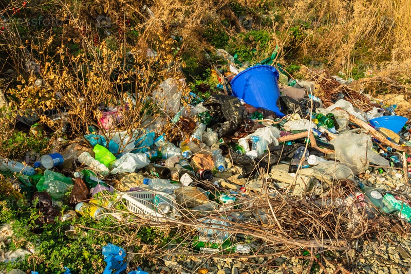 Пластиковые и стеклянные бутылки, пакеты и алюминиевые банки валяются среди камней и травы. Свалка мусора на природе. Концепция защиты окружающей среды