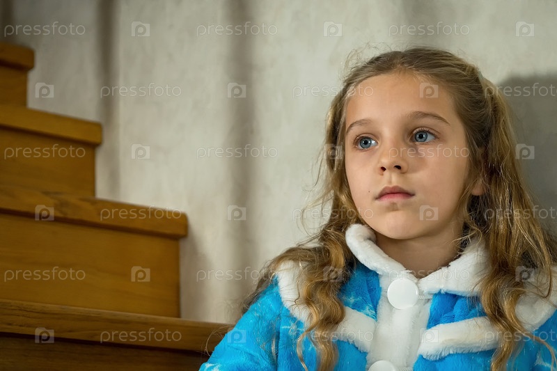 На деревянной лестнице сидит девочка-ребенок в голубом костюме снегурочки, ожидая Рождества, Деда Мороза и новогоднего чуда