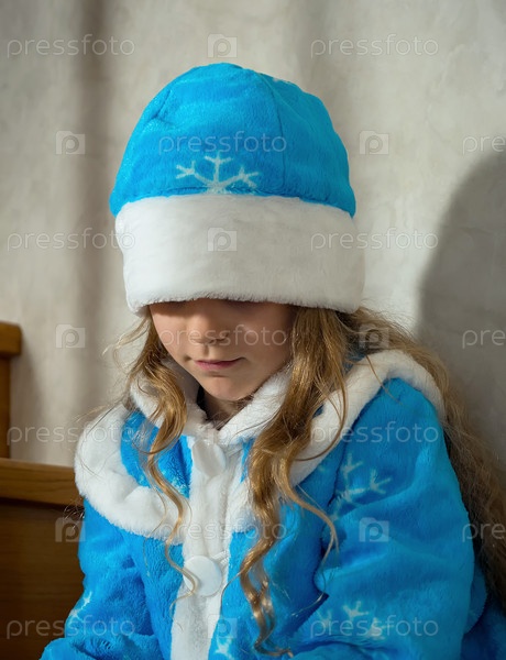 Девочка в голубом костюме и шапке снегурочки сидит на деревянной лестнице в ожидании Нового года и Санта-Клауса