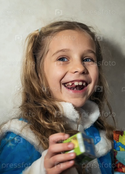 Улыбающаяся девочка в голубом костюме Снегурочки на сером фоне. Крупный план счастливого детского лица с отсутствующими зубами