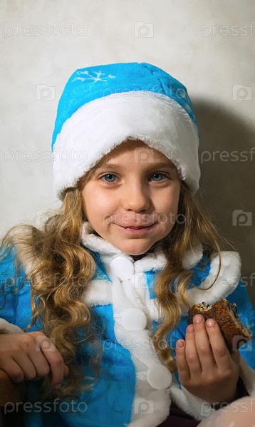 Довольная девочка в голубом костюме Снегурочки держит в руке рулетик с маком. Серый фон. В ожидании Деда Мороза