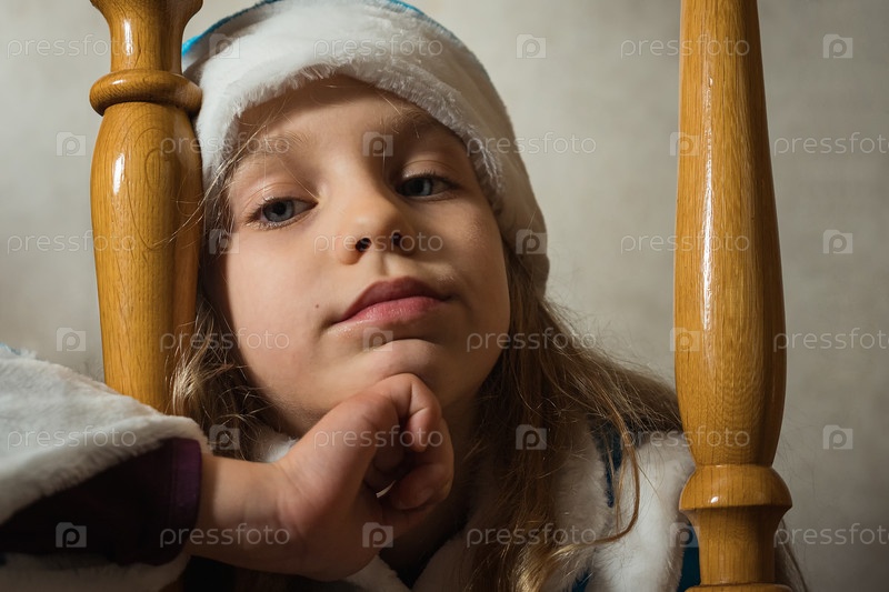 Крупный план лица девочки в шапке Снегурочки между двумя балясинами на сером фоне. Милое детское лицо