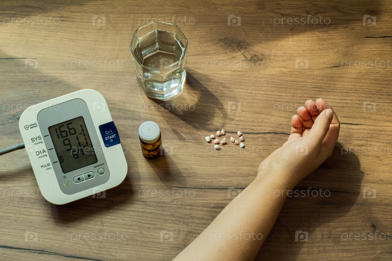 На деревянном столе стакан воды, пузырек с таблетками и автоматический тонометр. Женская рука лежит на столе. Прибор показывает высокое кровяное давление. Концепция здоровья