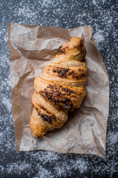 Вкусные свежеиспеченные круассаны с шоколадом на темном фоне. Французский завтрак. Вкусная выпечка крупным планом. Контекст пекарни с вкусным хлебом. Кондитерские изделия