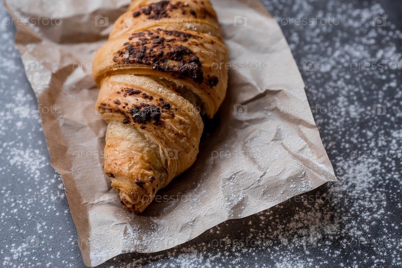 Вкусные свежеиспеченные круассаны с шоколадом на темном фоне. Французский завтрак. Вкусная выпечка крупным планом. Контекст пекарни с вкусным хлебом. Кондитерские изделия
